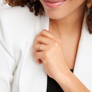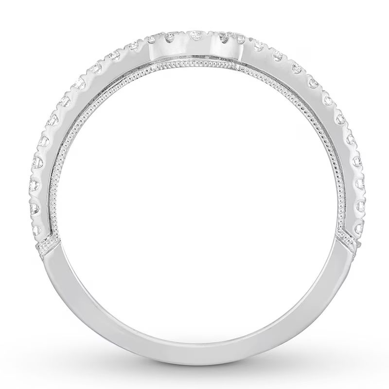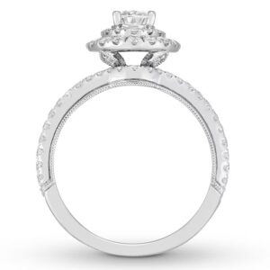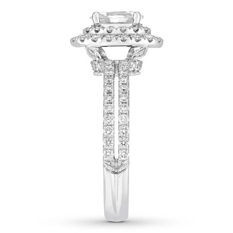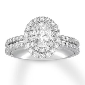 This wedding ring captures the modern beauty of a halo design. A brilliant 1 ct oval diamond center reflects a love of vintage design, while round diamonds add sparkle to the engagement ring’s split setting. The matching wedding band brings the total diamond weight to 1 7/8 carats. Both rings are crafted in 14K white gold.